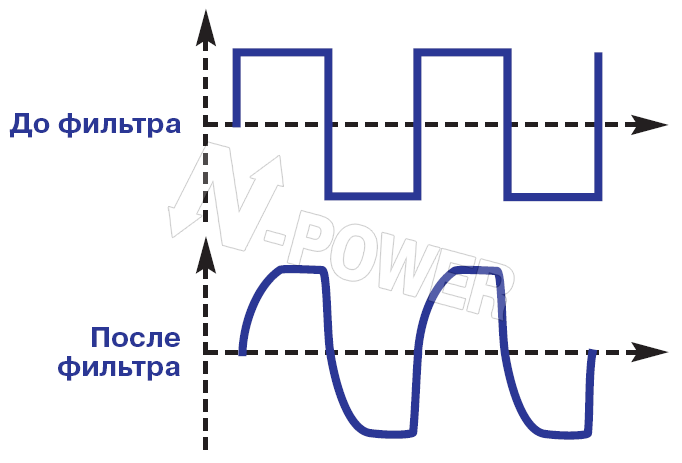 Инвертор – устройство, преобразующее постоянное напряжение в переменное. В зависимости от используемого принципа преобразования различают три основных типа инверторов (см. рисунки): инверторы, генерирующие напряжение прямоугольной формы, инверторы с пошаговой (ступенчатой) аппроксимацией (НЧ ШИМ) и инверторы с высокочастотной широтно-импульсной модуляцией (ВЧ ШИМ). Последние обеспечивают наиболее близкую к гармонической форму выходного напряжения. Кроме того, манипулируя скважностью импульсов ШИМ-сигнала, «интеллектуальные» инверторы, применяемые в ИБП сериях Mega-Vision, Pro-Vision Black, Power-Vision, Power-Vision Black, Power-Vision 3F и N-Power Evo компании N-Power, автоматически корректируют форму выходного напряжения при работе с нелинейной нагрузкой.